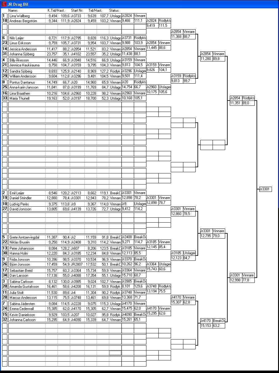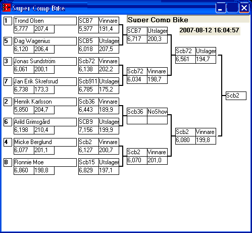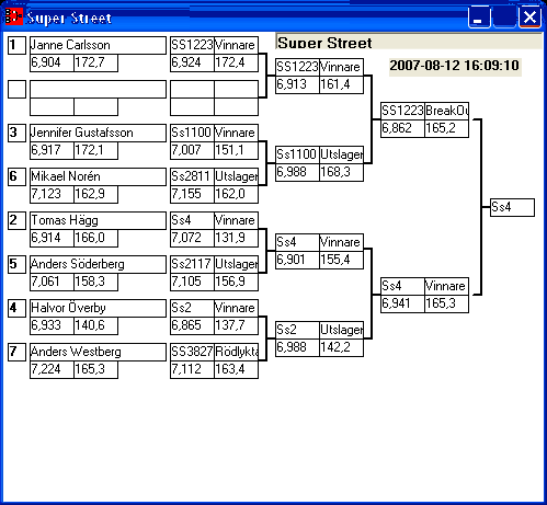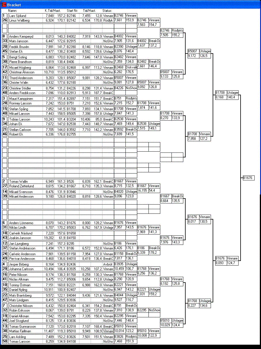 155 tävlande har kört och producerat 1134 tidkort. [2007-08-12] 16:11 Alla elimineringar är avslutade, uppdaterade stegar finns tillgängliga.