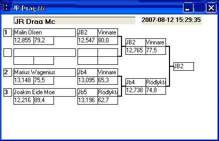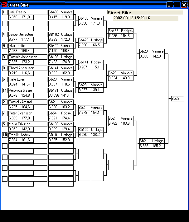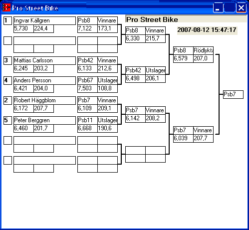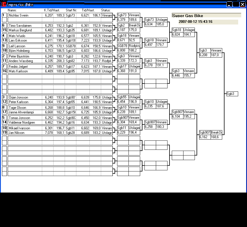 [2007-08-11] 14:52 Tredje omgången klar. Några snabba noteringar. Bracket, riktigt tajt i toppen, framförallt mellan de tre första! JR Drag bil, samma sak här men ända ner till kvalfemman. Street Bike är också relativt jämt i toppen. Super Gas Bike, riktigt jämt i toppen, de sju första ligger på 6, 2x tider som är BO. Super Street, Janne tillsammans med två & trean ligger på 6,9xx spännade! Klockan är nu straxt innan tre här i Lindesberg och vädret visar sin absolut bästa sida med sol och riktigt varm skön vind.