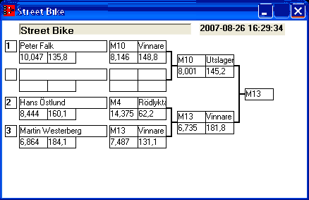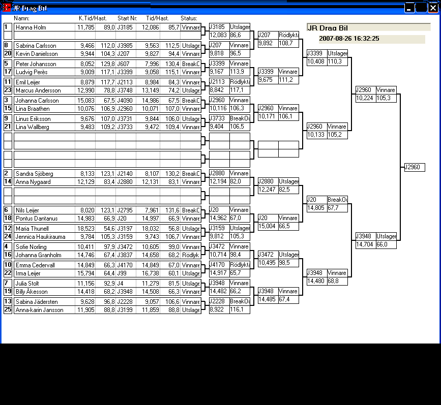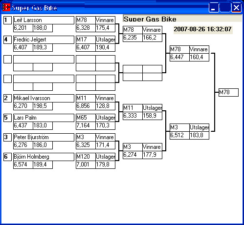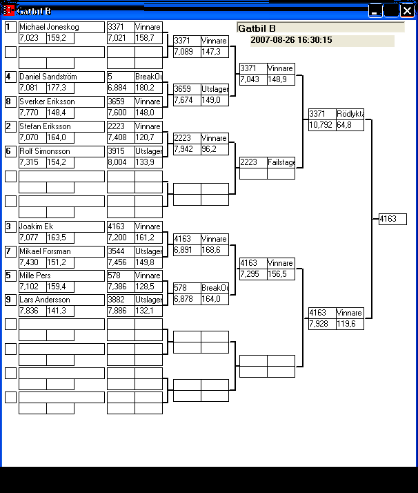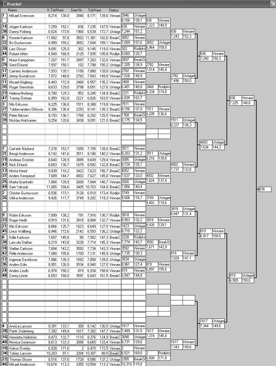 166 tävlande har kört och producerat 1124 tidkort. [2007-08-26] 11:39 Elimineringen är i gång, först ut Bracket.