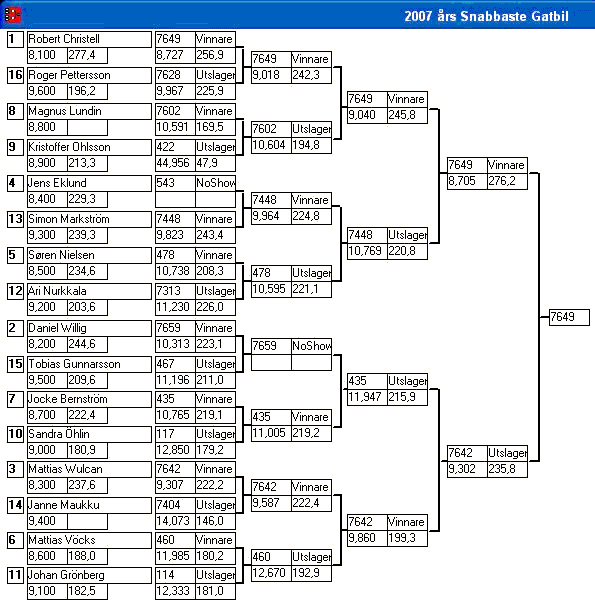 152 tävlande har kört och producerat 727 tidkort. [2007-09-01] 16:59 Tävlingen om årets snabbaste gatbil är avslutad. Grattis Robert Christell