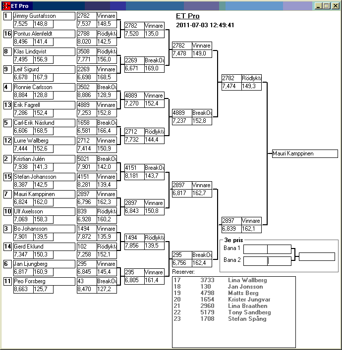 15:50 Sista kvalet kört för idag 15:35 Vi börjar närma oss stängningsdags, hitils har vi avverkat 8 kvalvändor 14:57 Nya listor ute... 13:50 Nya listor ute... 13:00 Tredje omgången klar. 12:05 Omgång två avklarad, litet lunchuppehåll 11:25 JR & ET Pro omg 1 klar