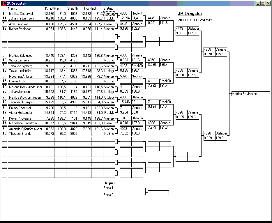 62 tävlande har kört och producerat 502 tidkort. 12:50 Finaler klara. Vi grattulerar till vinst i ET Pro, Mauri Kamppinen JR Drag, Mattias Edvinsson