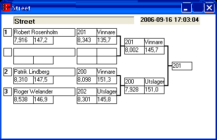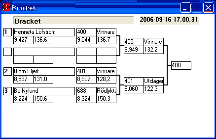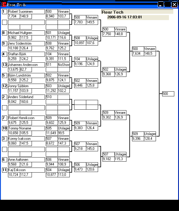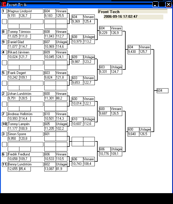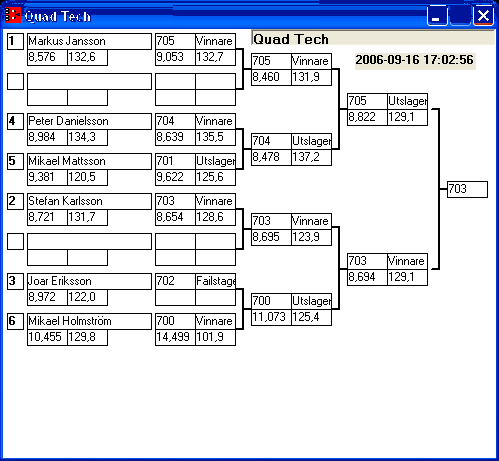 [2006-09-16] 16:07/17:07 lokal Allt rullar på i elimineringarna, vi är framme vid semifinaler. Stegarna blir nu uppdaterade...