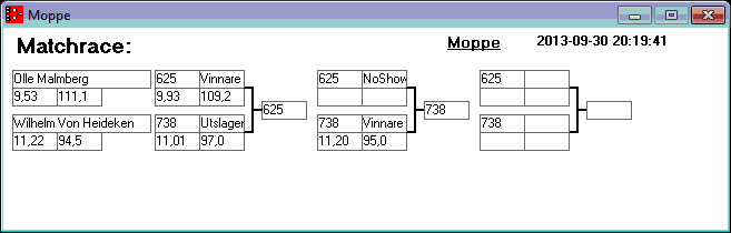 Vi vill förtydliga att Matchracet för Moppe-klassen aldrig kördes klart. Pga tidsbesparing kördes aldrig sista repan i bäst av tre, och därför blev Start nr 738 (Wilhelm) vinnare!