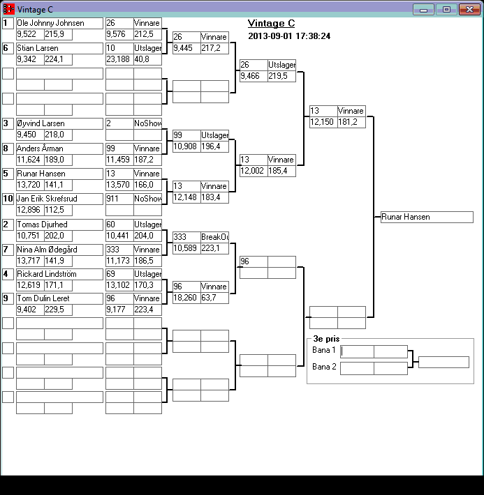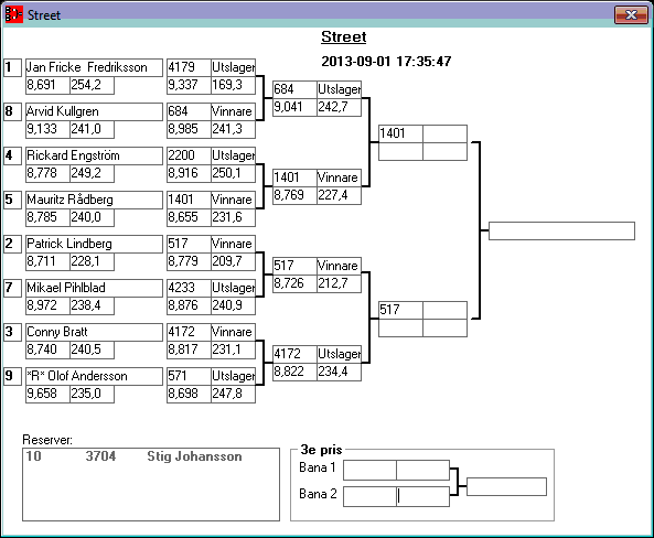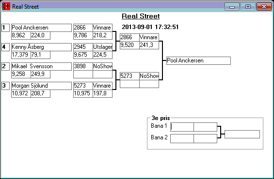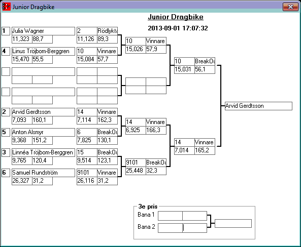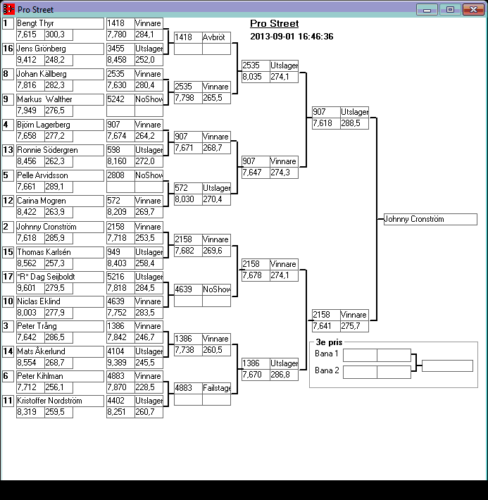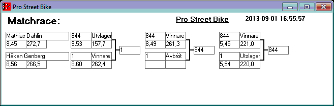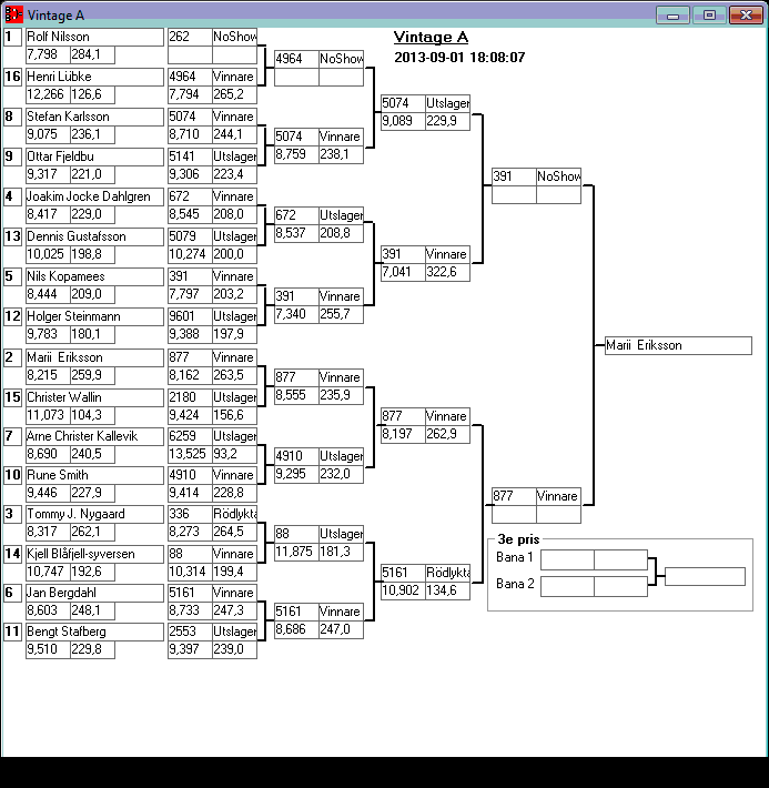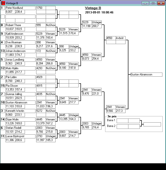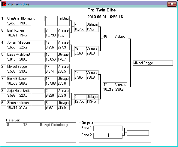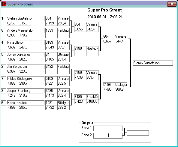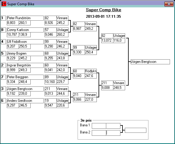 195 tävlande har kört och producerat 746 tidkort. Stegar uppdaterade efter dagens körningar. Tack för denna helgen. Kl 18,13 Stegar uppdaterade, 15,08 Stegar uppladdade, 13,36 den 1 sept Kvallistor och stegar publicerade. 23,44 Preliminära kvallistor 20,13 Kvallistor uppdaterade 19,07 Första kvalrundan färdig och en del på kvalrunda 2 Kvallistor uppdaterade 18,00 Kvallistor publicerade 17,17 den 31/8